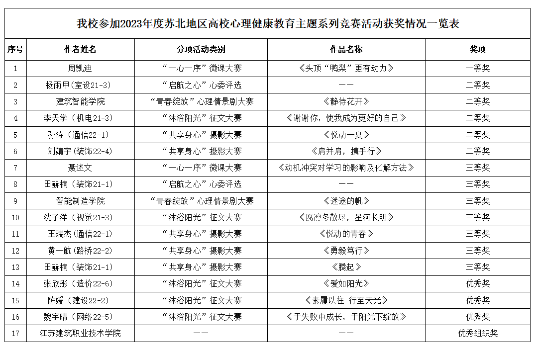 11月14日,江苏省苏北地区大学生心理健康教育研究中心公布了2023年度苏北高校大学生心理健康教育主题系列竞赛活动获奖情况,我校再创佳绩,共获一等奖1项、二等奖5项、三等奖7项、优秀奖3项,uwin电竞蝉联优秀组织奖。