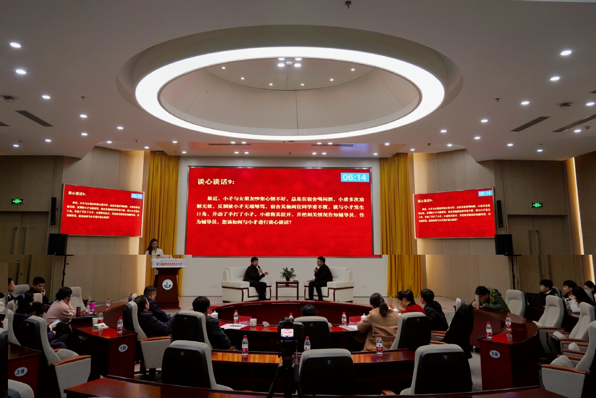 本次大赛共有初赛与决赛两个部分,经过笔试初赛选拔,最终有30名辅导员进入决赛。决赛包括案例研讨和谈心谈话两个环节。案例研讨环节中,参赛辅导员紧扣案例核心,旁征博引,抽丝剥茧,围绕案例的问题本质、解决思路、实施办法等进行分析阐述,展现了辅导员日常工作的积累与思考。谈心谈话环节则是以情景再现的方式与学生进行谈心谈话,循序渐进,化危转机,充分贴近学生思想实际,真实展现辅导员的工作现场和辅导员的专业水平。