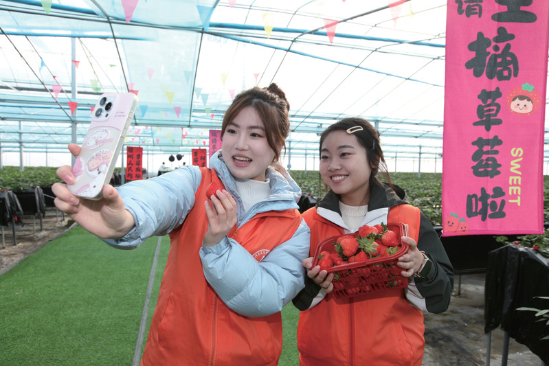 12月17日,江苏uwin电竞技术学院经济管理学院电子商务专业的学生在徐州市铜山区三堡街道一农场直播销售草莓。近年来,该校与三堡街道开展校地共建,为大学生搭建社会实践平台,借助电商平台助力地方农产品销售。(蒯创 摄)