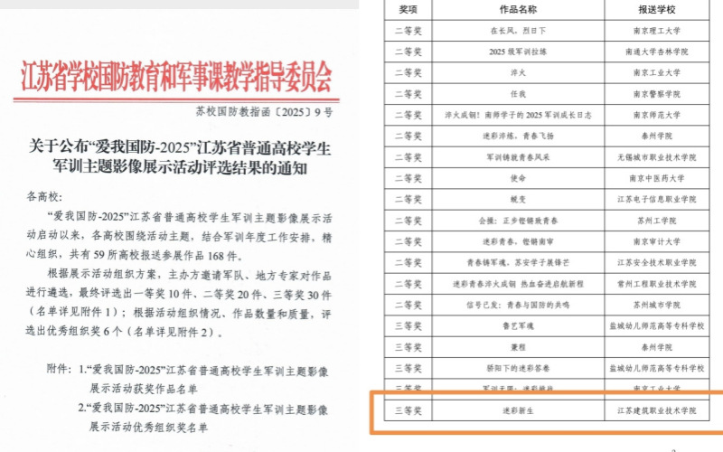 同期,在省uwin电竞国防教育和军事课教学指导委员会主办的“爱我国防-2025”军训主题影像展示活动中,我校报送的作品《迷彩新生》获省级三等奖。