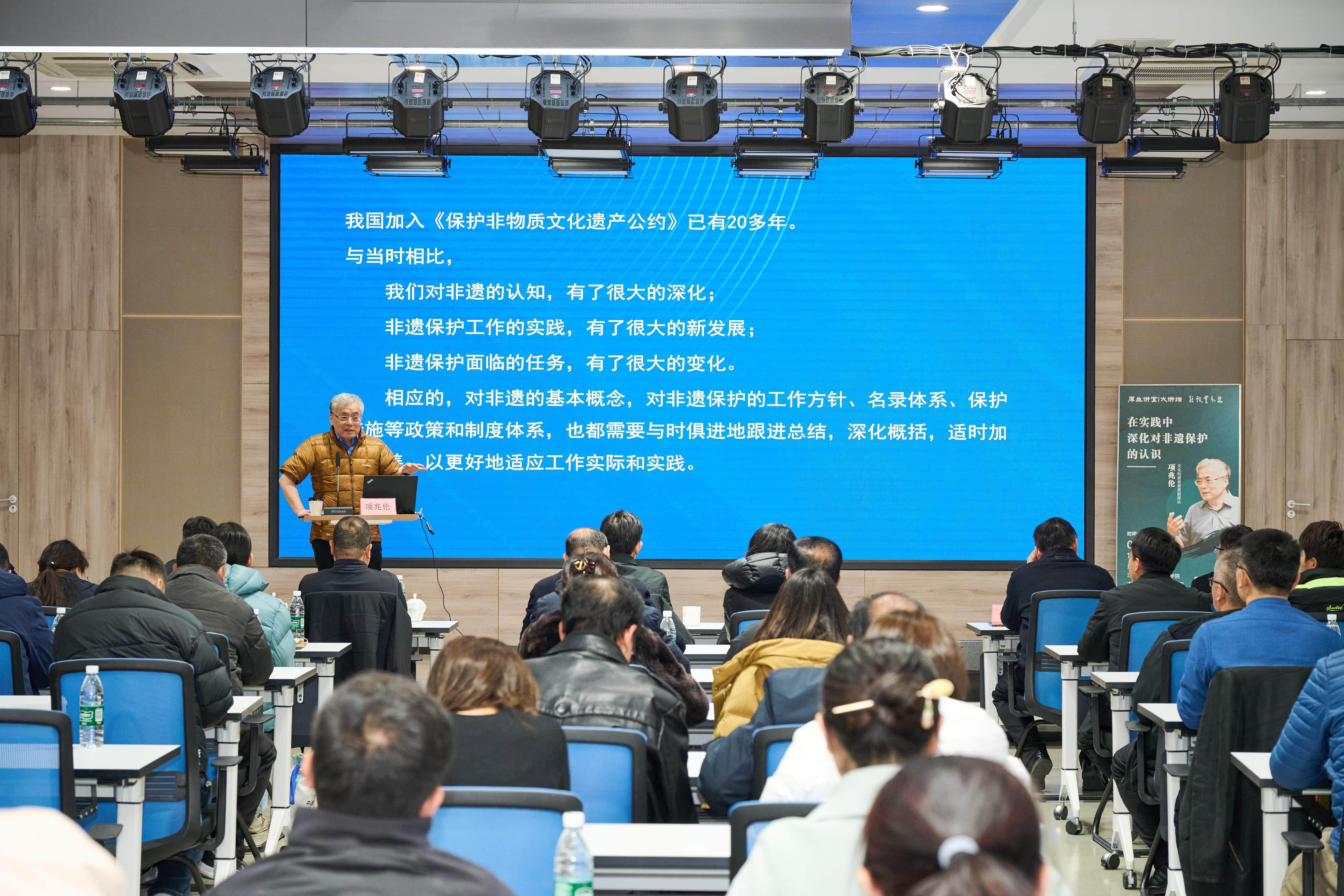 在专题讲座环节,项兆伦以《在实践中深化对非遗保护的认识》为题,系统阐述了“用整体观、发展观、实践观看非遗”的核心理念,以及“人类非遗代表作名录申报”的相关实践。他指出,非遗是“活态文化遗产”,保护应坚持“见人、见物、见生活”的理念。讲座强调,要以习近平新时代中国特色社会主义思想为指导,推动非遗与现代生活相融合,同时回顾了“中国非遗传承人群研修研习培训计划”的实施历程,并分享了我国在传承人研培与振兴传统工艺方面的实践经验。